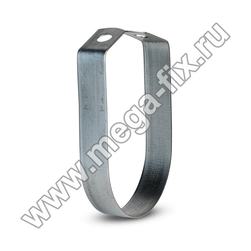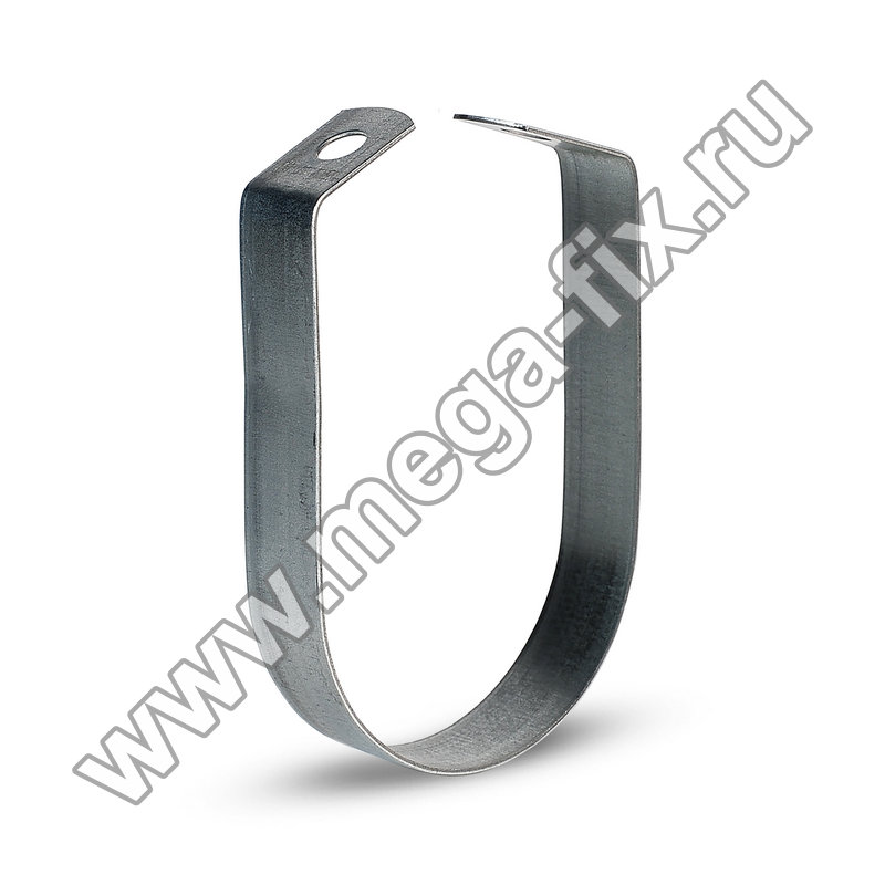 Крепление имеет грушевидный профиль. Труба в креплении лежит свободно. Для того, чтобы ее вставить в хомут, верхняя петля разводится, изделие надевается на трубопровод и затем края опять смыкаются вместе. Подвеска производится на резьбовую шпильку.